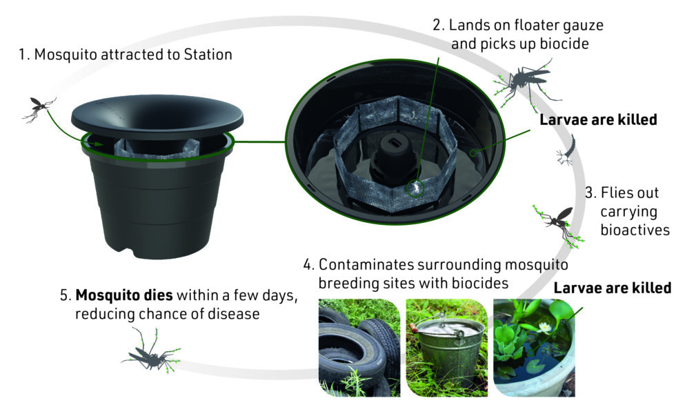 The stations contain an attractant that lures mosquitoes to lay eggs inside. The eggs become contaminated with larvicide and fungal spores, which are then transferred to other breeding sites, further reducing mosquito larvae and adult populations. It’s a targeted and environmentally friendly approach.