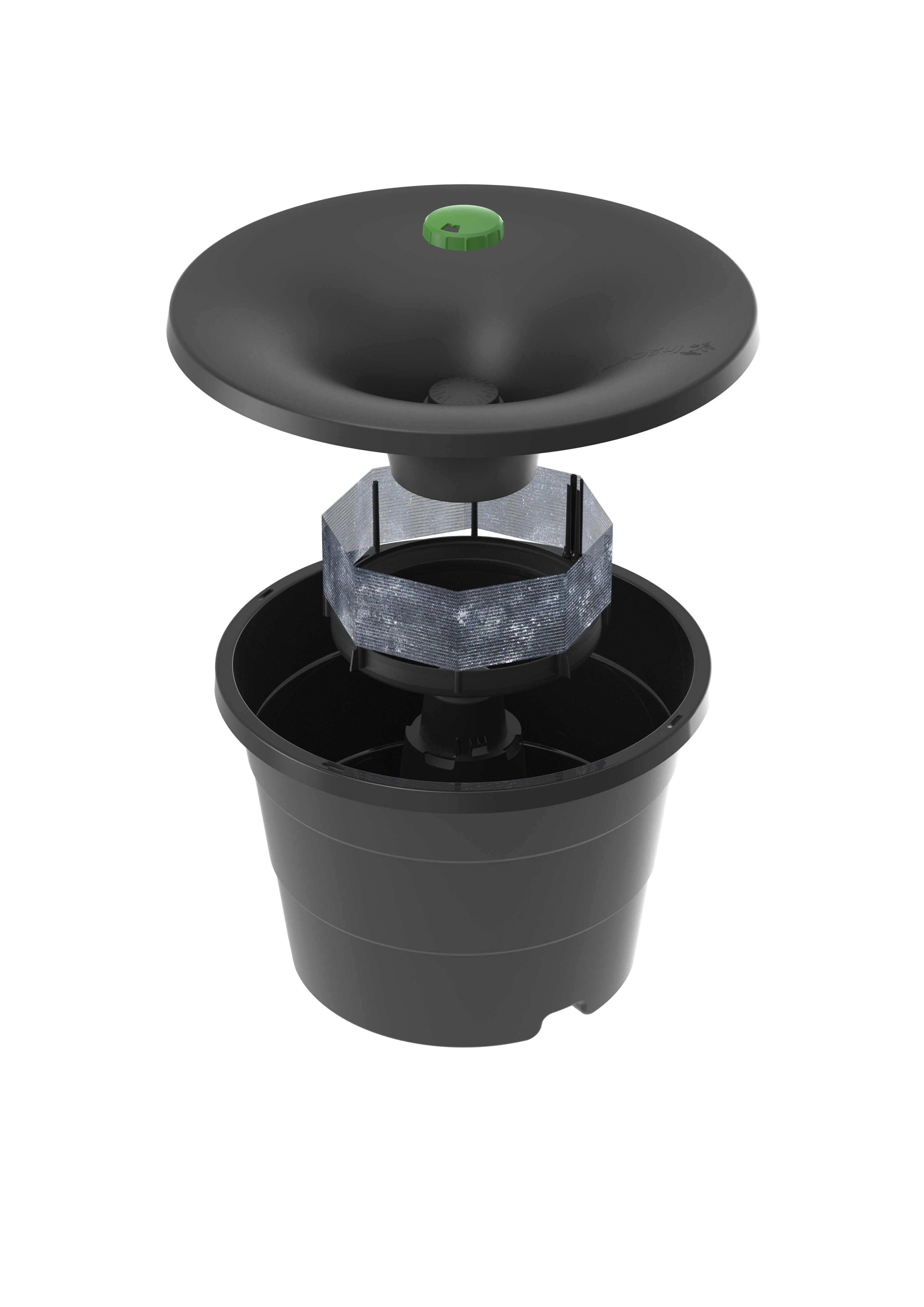 The In2Care® Mosquito Station is made of durable recycled polypropylene (PP) components, and consists of a lid, central tube, click-on interface and reservoir. A floater moves along the central tube with the water level and serves as the landing/resting site for mosquitoes. Female mosquitoes are attracted to the Station by adding a tablet with attractive odours to the water. When a female enters the Station she lands on the floater covered with a gauze strip that binds a mix of biological agents with specific modes of action. All biological agents are in use for pest control and are US-EPA approved.